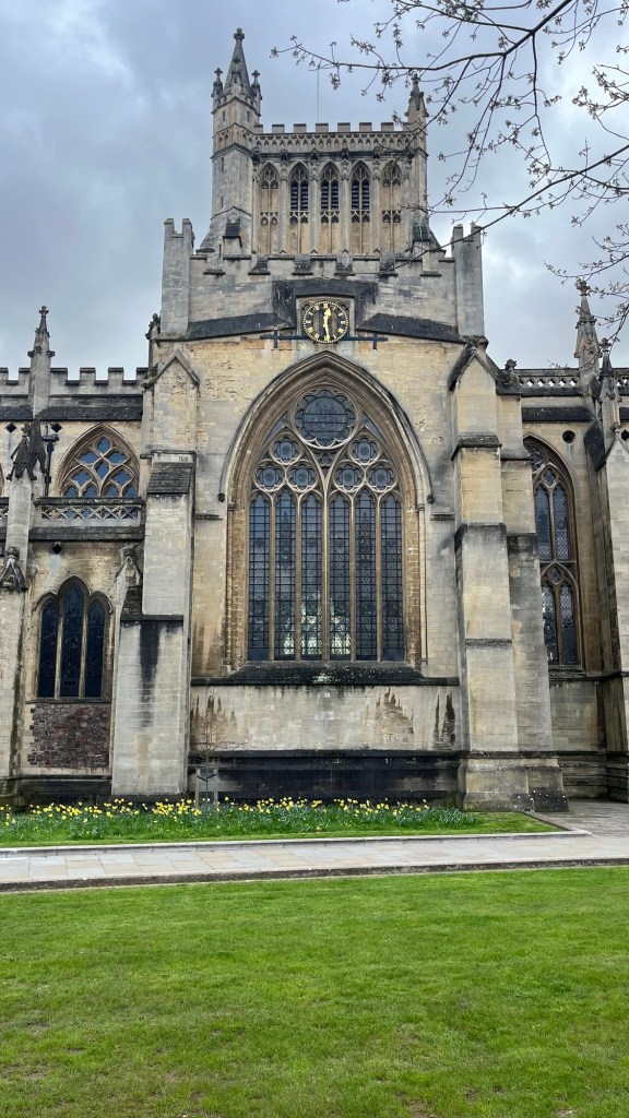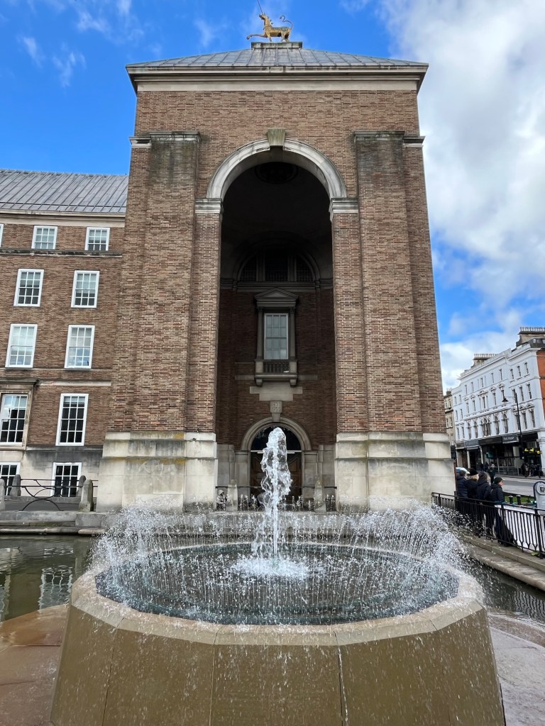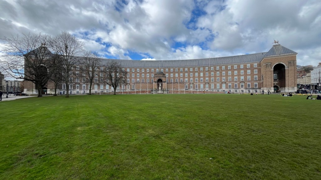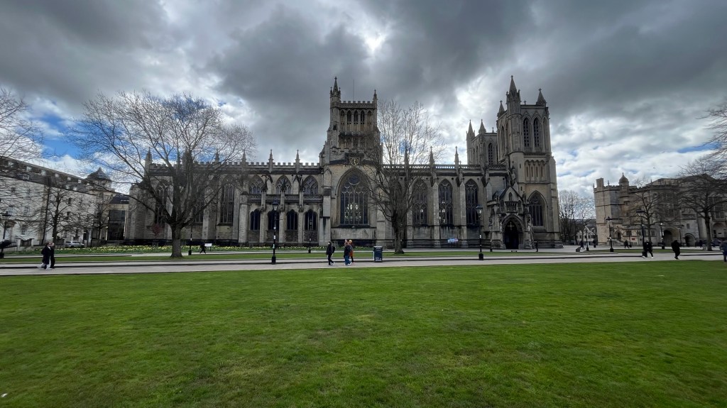 With the walk underway the weather also decided to adjust itself on us with the clouds exhaling down on us occasionally, luckily was only some light rain however. We first came across a snazzy little street on our adventure which showcased the inner beauty of Bristol further endorsed by walking to the Bristol Town hall and Cathedral, both breathtaking buildings that leave their presence known for those that are luckily enough to be in it. The Town hall is an older curved building that has taken symmetry to a whole new level, the Cathedral a Gothic masterpiece standing proud.