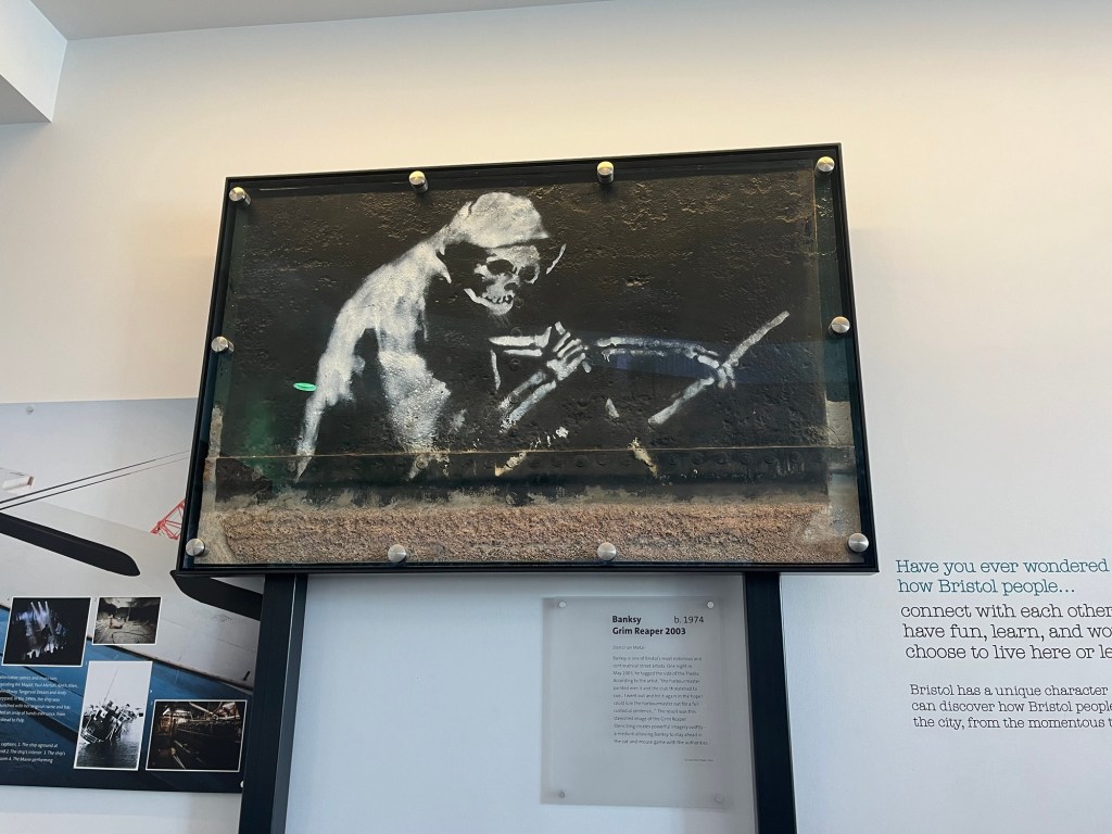 We retraced our steps down the street, passing by tantalising food markets (which we later indulged in for lunch) and traversed across the docks toward our next destination. Upon arrival, we found ourselves at the Mshed, a free-to-enter museum where one of Banksy’s artworks was on display. This particular piece had an interesting history; originally painted on the side of a ship by Banksy, it was later painted over by a disgruntled harbour master. Undeterred, Banksy recreated the artwork, this time using stencils for efficiency and evasion. Eventually, the owners caved and removed a portion of the ship to display it in the museum. Also we decided to have a quick gander around the museum while here, which housed some artefacts from early life in Bristol and England if thats something that peaks your interest.