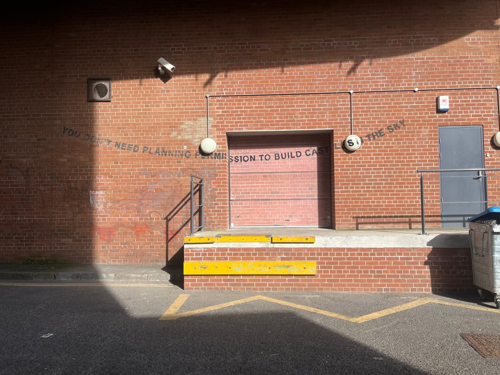 I’m going to also include the next work of Banksy’s in this because I’m not gonna lie I found it a little lame, for it was just some words really. This one took us back across the docks again on our way back, its called: ‘You don’t need planning permission to build castles in the sky’. Now I know theres a deeper meaning there but sure add some picture or something more then words.