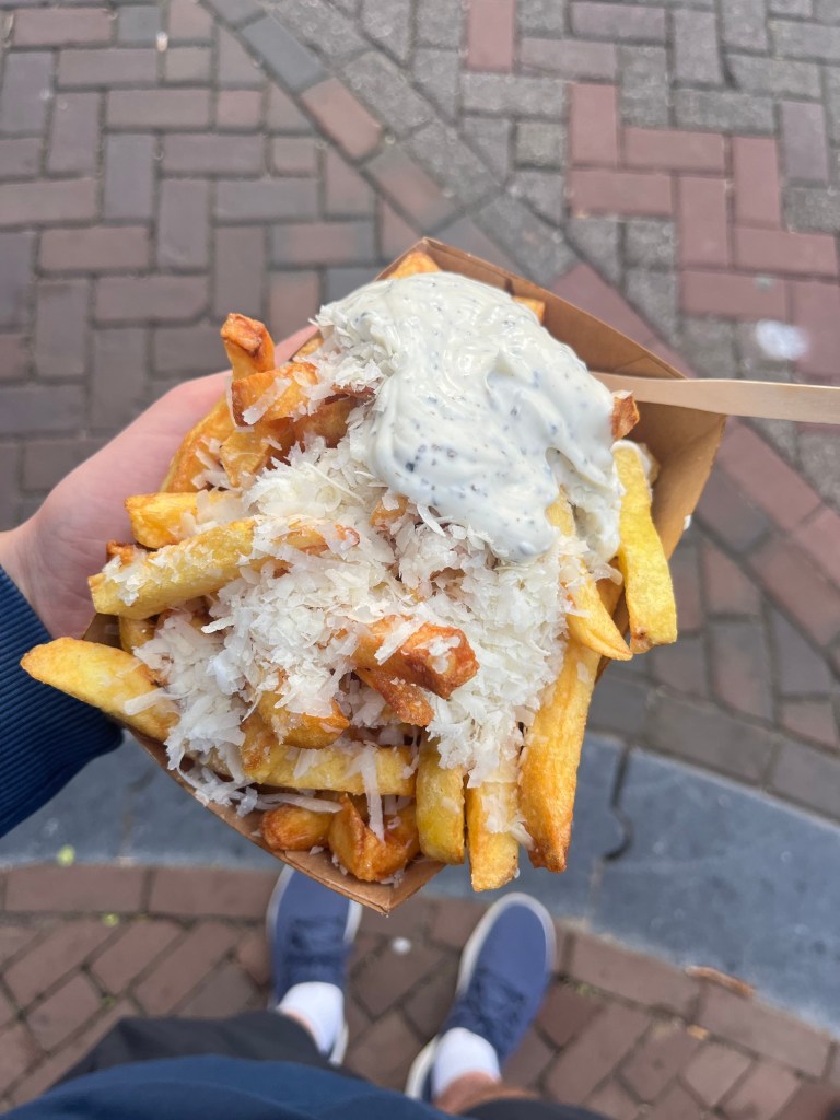 After all this, it was time to get some food for an early dinner. We ended up wandering for a while, finding a place Matt had seen on TikTok famous for their fries, cheese, and truffle sauce. We did finally locate this place, and yes, the fries were good. But in this process, I have come to the conclusion that Amsterdam is a very confusing place. I mean, with all the canals and buildings, everything looks the same—not helpful on the old brain, so a phone map is definitely needed.