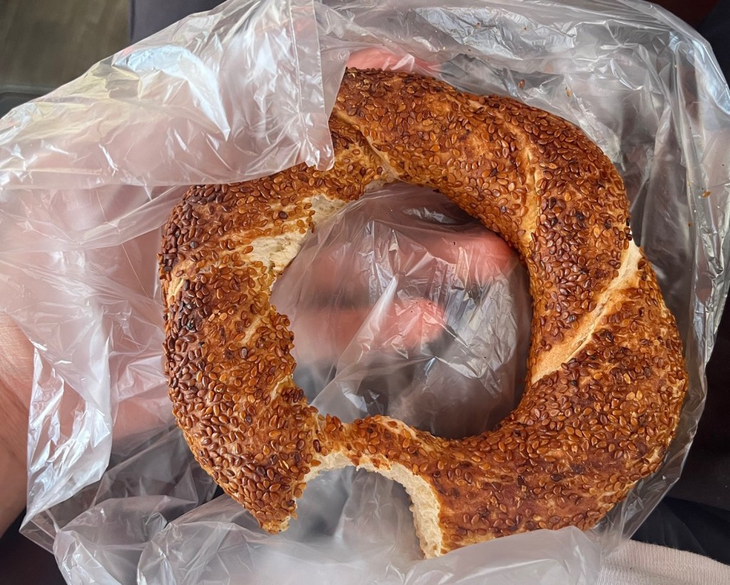 As the stations ticked past, a man came on board selling food—like they do in Turkey. Score! A simit was purchased and did the job for the rest of the journey. On this bus ride, there was also a free muffin handed out, along with some soft drinks. Added bonus for the long journey!