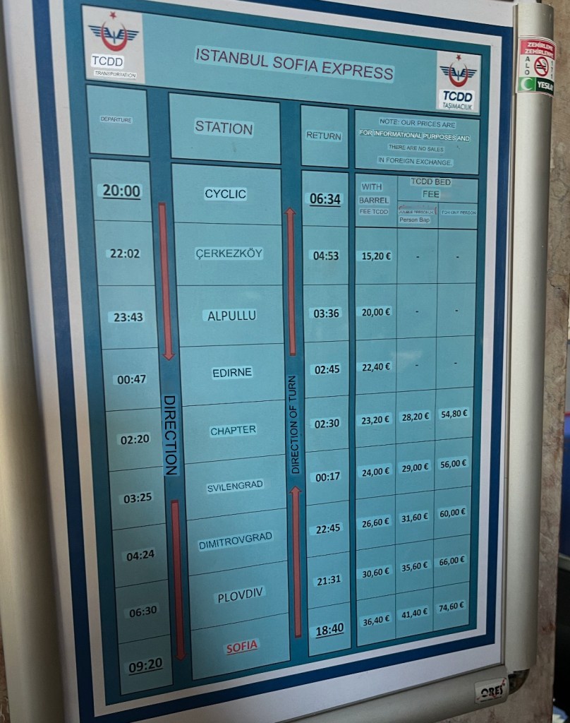 Now, instead of heading straight to the Wabi Sabi Hostel in Istanbul, we hopped on a train to get the night train tickets for a couple of days’ time from Istanbul to Sofia, Bulgaria. This time, we went right away so we wouldn’t miss out on tickets. After catching a couple of trains, we arrived at the station where you can purchase these tickets (Halkali Station). We booked a two-bed cabin, which ended up being very reasonable. The tickets for this train have to be hard copies only, so once you have them, be a champ and don’t lose them. Have a gander at the schedule below for your own big-brain knowledge (I even have a translated version for you).