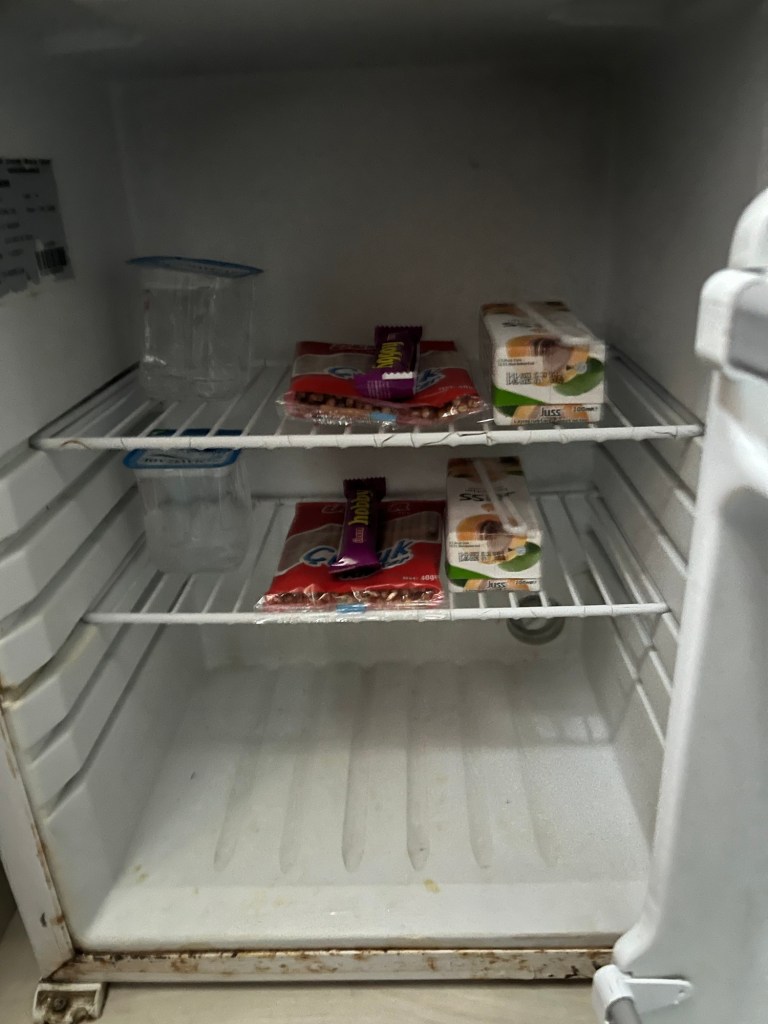 After passing through airport-style security, the train came into sight—a beautiful sight indeed. Opening the door to the two-bed cabin revealed a fridge stocked with water, juice, pretzel sticks, and a chocolate bar. For a night train, this is all you can get, so I highly recommend bringing your own snacks and water, as I did. The food in the fridge was just an added bonus.