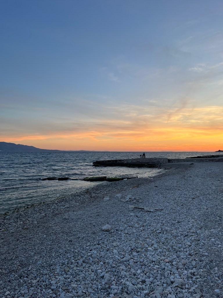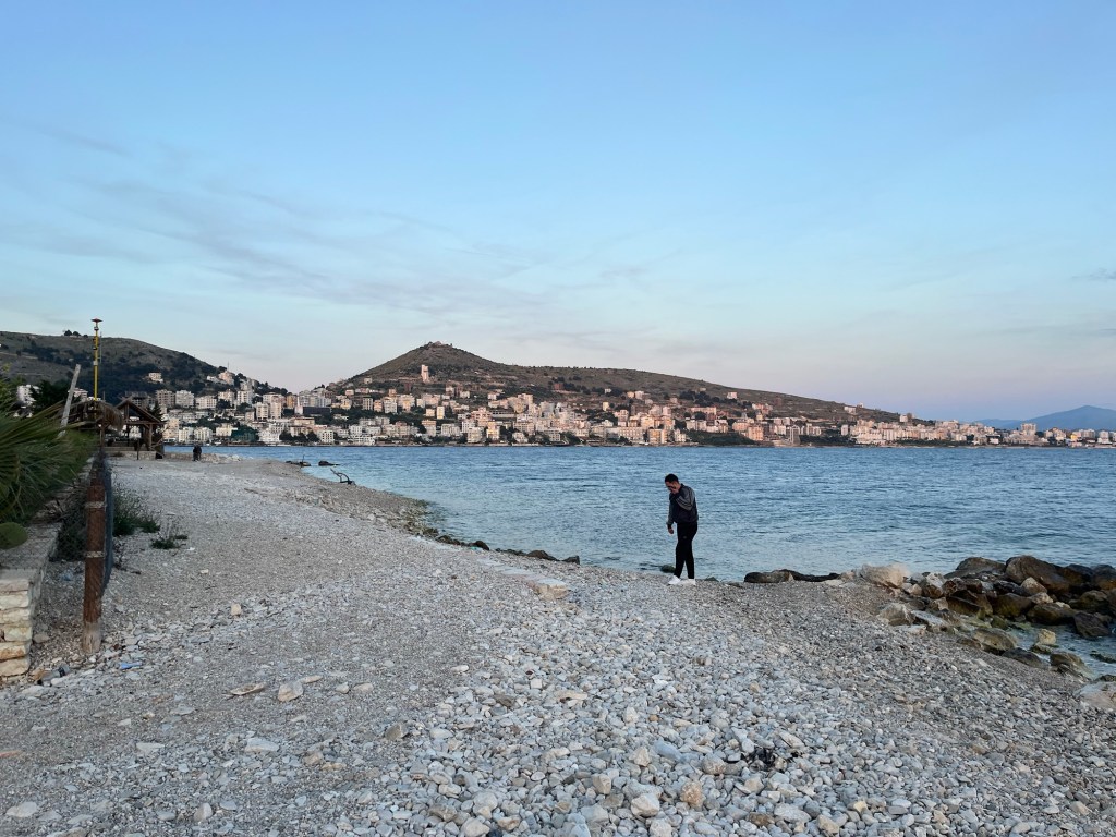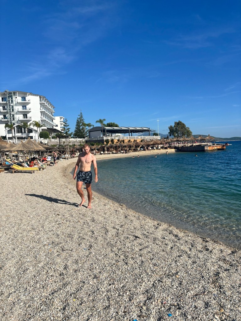 Unpacked and ready to go, it was time for a quick dip to refresh myself from the journey. The beach was quite stony, as most are around Albania, but that also meant the water was clear and inviting, so I dove right in. I emerged like a less-than-impressive version of Aquaman, dripping dry in the sun, which still had a bit of kick to it even at 6 PM.