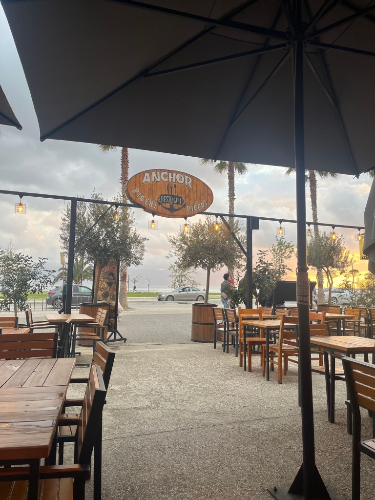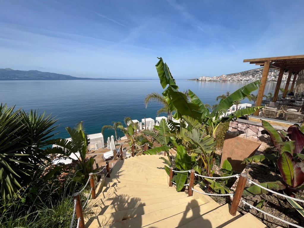 After some wandering, we finally reached the Sarandë waterfront. We strolled up and down a few times in search of food, even jumping on the other end of a seesaw with a random kid who was eagerly begging for someone to join him. Eventually, we found a spot to eat. With one meal and a drink down, it was time for some gelato and to snap a few more photos of the sky, now painted in beautiful pink and blue hues. The view from the waterfront, complete with what I can only describe as a “stairway to heaven,” made for a perfect backdrop (see slideshow below).