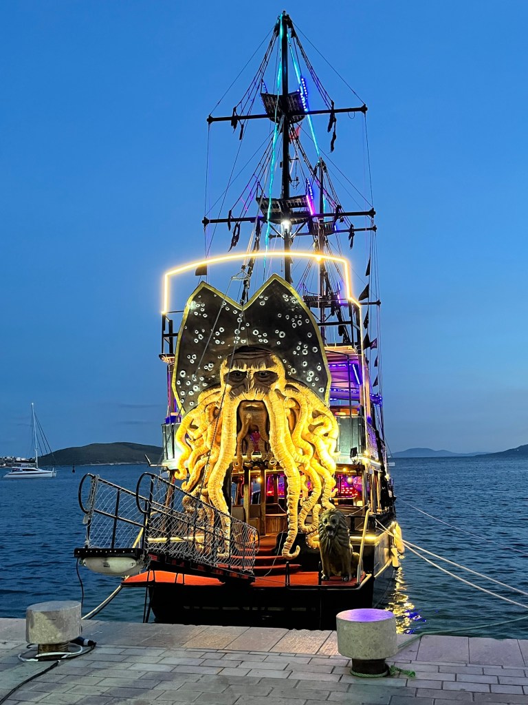 As we wandered along after dinner, we stumbled upon a Davy Jones ship. One of the promoters eagerly approached us, revealing it was a party boat that set sail every night at 9 PM for a “Pirates of the Caribbean” style bash. After a hard pass, we continued our quest to find a spot along the waterfront to watch Manchester United play.
