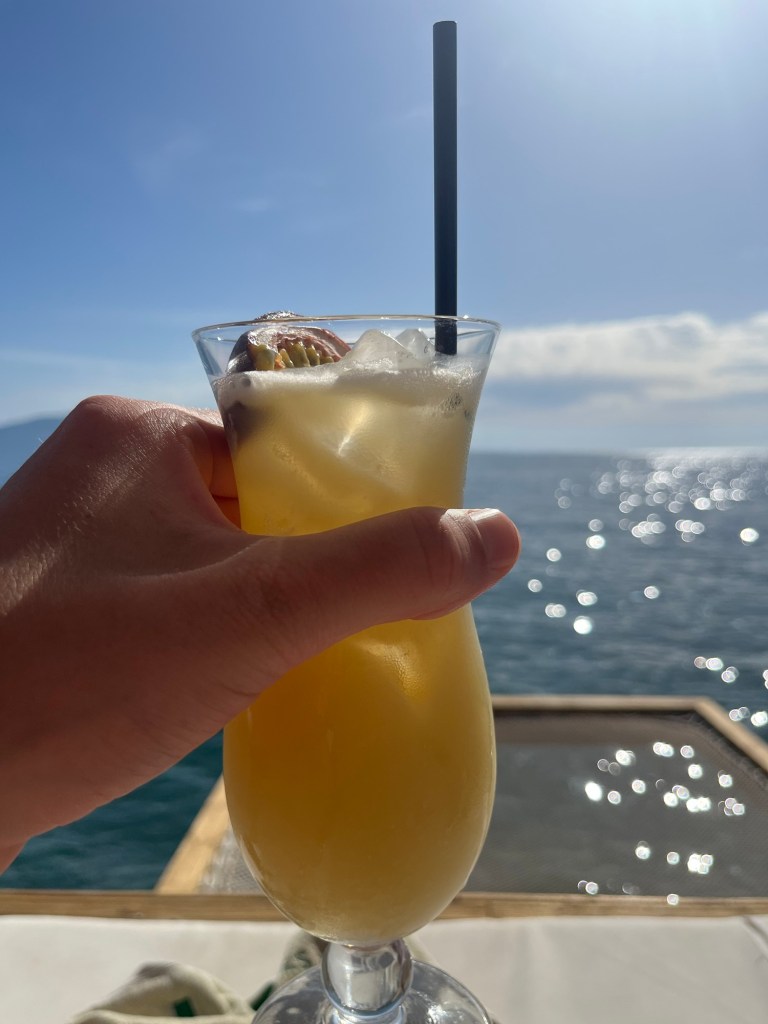 As the day turned into afternoon, it felt only right to indulge in a Piña Colada. What a great decision that was! It was cold and refreshing, especially as the sun peeked out and the wind died down. I took the opportunity to dive back into the water, practicing my best cannonballs off the net and enjoying the refreshing escape from the sun.