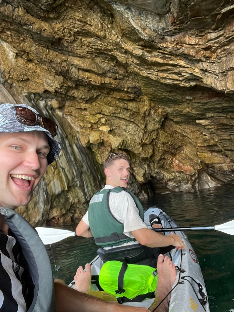 One of our new favourite kayaking activities became “shooting the gap.” This involved finding a small space between rocks, sometimes barely wider than the kayak itself, and gunning it straight at it. The thrill of commitment was exhilarating, and to our surprise, we made it through every single time—luckily!