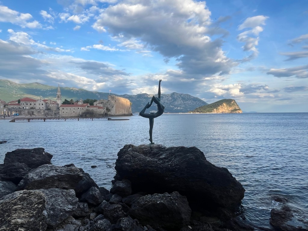 Just a short walk further along the coast, about two minutes from the previous picturesque spot, we came across a tourist attraction that added a bit of charm to the journey—a sculpture of a woman striking a graceful pose on a rock, with a stunning backdrop of the Adriatic Sea and the landscape behind her. It was a captivating sight, and as you’d expect, it draws plenty of attention from passersby for both the art and the views.